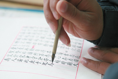 广陵古籍刻印社的工艺师在写样,据此来雕版印书。新华社发(崔根元摄)