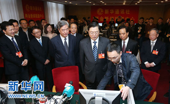 下午5时30分许,十二届全国人大二次会议主席团第四次会议结束后,张德江和全国人大常委会副委员长李建国、王晨一同前往设在人民大会堂内的新华社两会新闻报道中心,看望采编和技术人员,同大家一一握手,亲切问候,并仔细观看了新华社两会集成报道和新华网专题报道演示。随后,张德江等与人民日报、新华社、光明日报、经济日报、中央人民广播电台、中央电视台、中国国际广播电台、中国日报、法制日报、中国新闻社等新闻媒体负责人和工作人员亲切会面交谈。