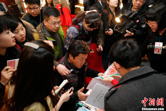3月2日,北京国际饭店。参加全国政协十二届二次会议的赵宝刚在报到时被记者围堵,并被追问是否看过韩剧《来自星星的你》。中新社发盛佳鹏 摄