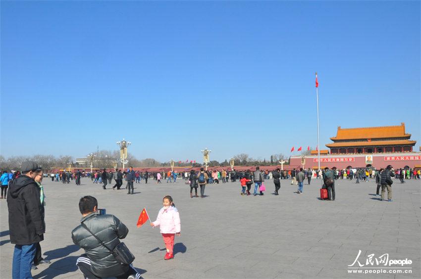 2014年全国两会召开在即,记者看到天安门广场秩序井然,游客络绎不绝。今天天气晴朗,人们尽情享受北京的春天。