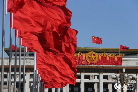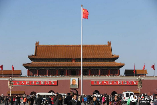 2014年03月01日,两会前夕天安门广场彩旗飘飘。