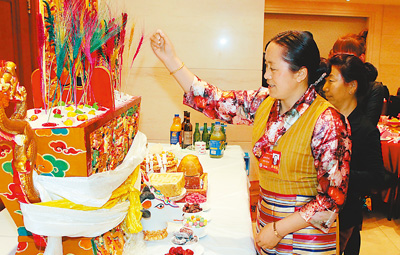 3月2日,西藏代表团下榻的京西宾馆办了一场朴素的藏历新年联欢会,代表们在切玛盒前祝福新年。记者 扎 西摄