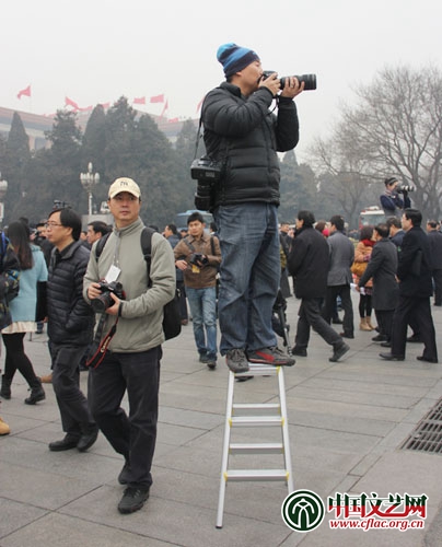 3月3日,全国政协第十二届二次会议在北京人民大会堂开幕。图为摄影记者们拍照工具:梯子。中国文艺网 丁薇 摄