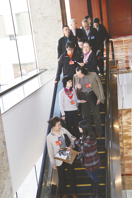 为了能够采访到文艺界的明星委员,各路记者趁着委员们下电梯的空隙上演了一场移动采访“大站”。