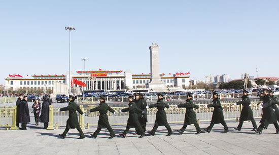 两会期间,警卫人员从人民英雄纪念碑前走过。中国文艺网 金涛 摄