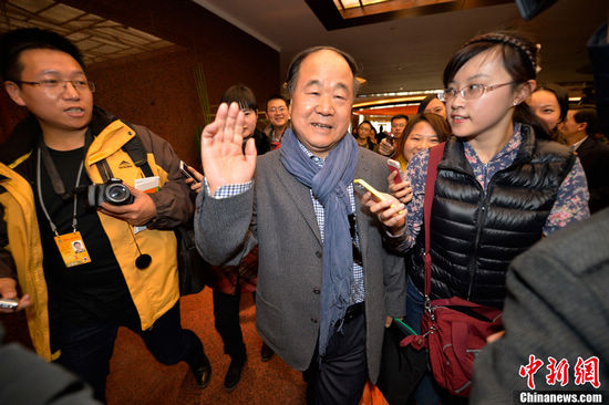 3月2日,全国政协委员、诺贝尔文学奖得主莫言现身驻地,面对众多媒体层层包围,他提醒身边的追访记者“当心,别摔倒!”。中新社发骆云飞 摄