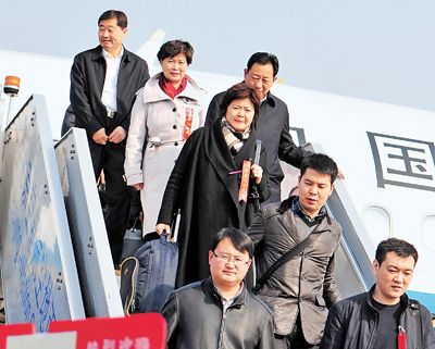 图为3月2日,吉林代表团成员乘飞机抵达北京首都国际机场。本报记者 史家民摄