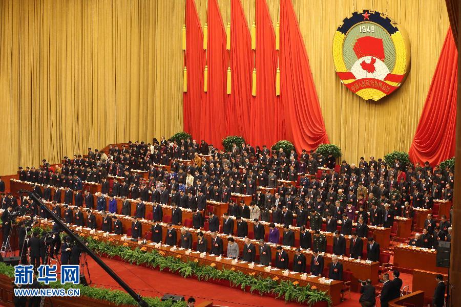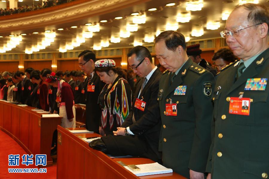 3月3日,中国人民政治协商会议第十二届全国委员会第二次会议在北京人民大会堂开幕。这是全体与会人员为在3月1日晚云南昆明火车站发生的严重暴力恐怖事件中遇难的群众默哀。新华社记者丁林摄