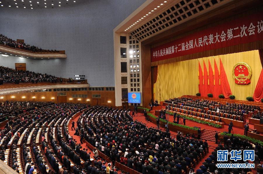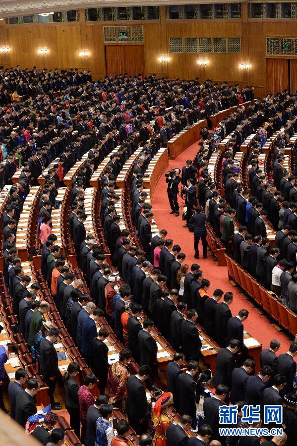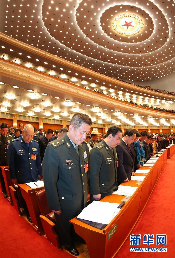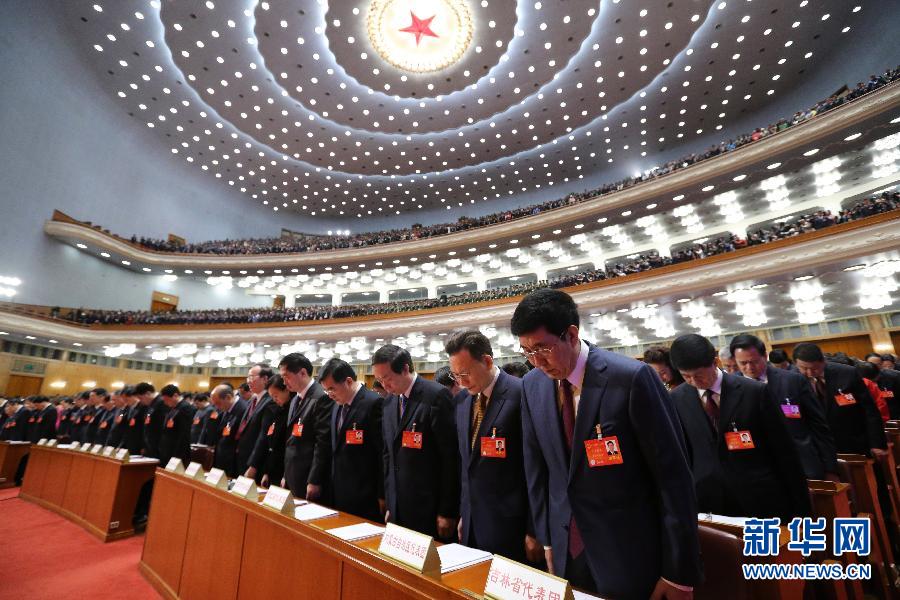 3月5日,第十二届全国人民代表大会第二次会议在北京人民大会堂开幕。全体与会人员为3月1日晚在云南昆明火车站发生的严重暴力恐怖事件中的遇难群众默哀。新华社记者饶爱民摄