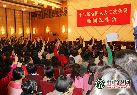 3月4日,十二届全国人大二次会议新闻发布会在京举行。图为新闻发布会现场,众多媒体朋友现场提问。 中国文艺网 金涛 摄
