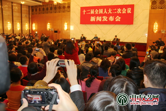 3月4日,十二届全国人大二次会议新闻发布会在京举行。图为新闻发布会现场,众多媒体朋友现场拍摄。 中国文艺网 金涛 摄