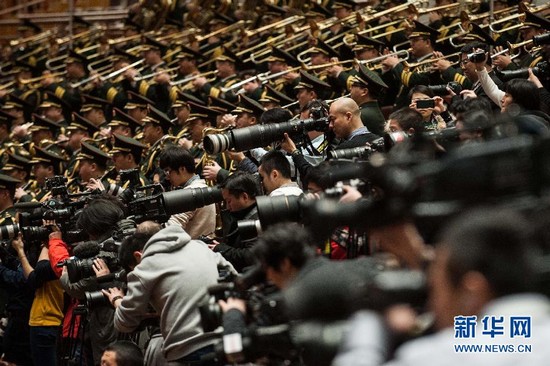 3月12日,全国政协十二届二次会议在北京人民大会堂举行闭幕会。这是媒体记者在会场采访。 新华社记者刘金海摄
