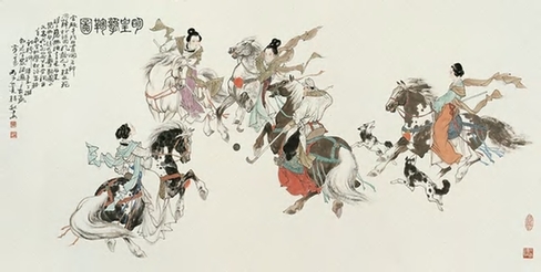 明皇击鞠图。击鞠亦即打马球,也是北方端午节的主要经济娱乐活动之一。相传,唐玄宗利隆基便是这项运动的爱好者。
