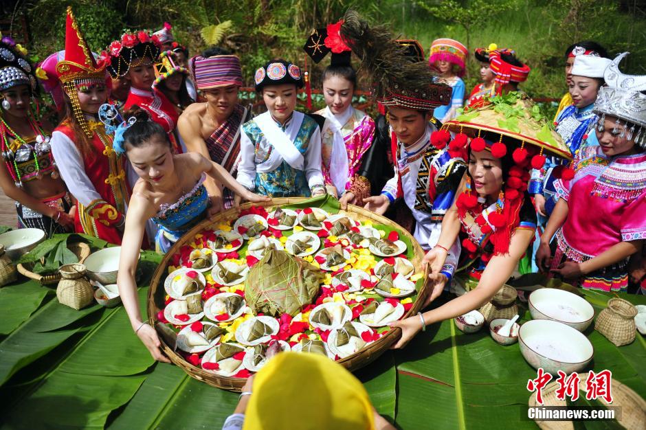 5月29日,26个民族的民众身着节日盛装,齐聚云南普洱太阳河国家公园包“民族团结粽”,迎接端午节的到来。中新社发 刘冉阳 摄
