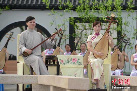 9月2日,两位评弹演员和苏州评弹学校的学生们彩排节目。当日,“苏州月·中华情”2014年中央电视台中秋晚会在苏州太湖之滨紧锣密鼓地彩排中。据本次晚会总导演周晓岚介绍,今年晚会创作中运用了很多苏州元素,昆曲、评弹都将一一融入节目,舞台背景和布置上,也会结合小桥流水、粉墙黛瓦的苏式风格。她表示,苏州的文化艺术也代表了中国传统文化艺术,它是一种符号,希望通过这个符号来放大中国传统优秀文化,让全球的华人在月明团圆的日子里,感受到我们自己文化的博大精深。中新社发王思哲 摄