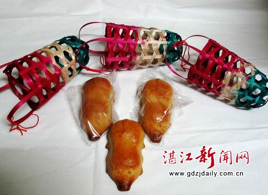 做成小猪形状的月饼,装在竹笼中,是中秋节的应节食品。