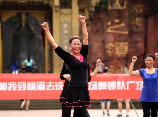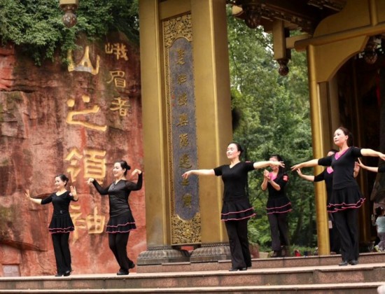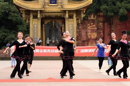 抛弃城市喧嚣,享受清新慢生活,6月21日,来自四川成都数十家大型社区的广场舞领队大妈们,在峨眉山麓报国寺景区第一山亭广场跳起了风靡全国的广场舞。大妈广场舞首次进入景区,一度引来众多市民游客朋友关注的目光。