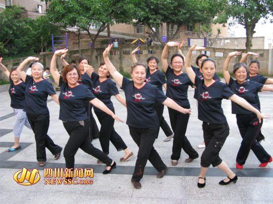张大妈在国内教跳“坝坝舞”。(前排中为张大妈)