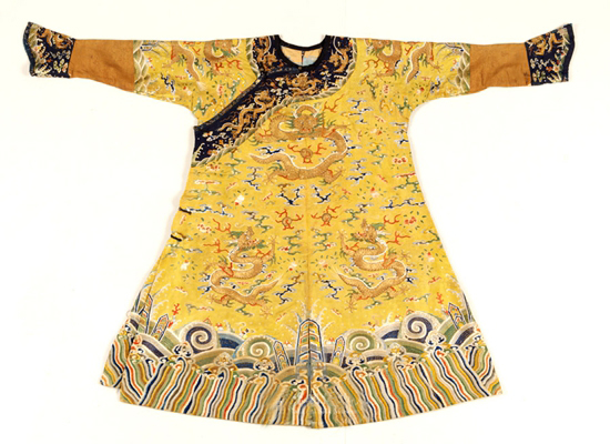 龙袍传世较多,但如此小龙袍实属难得,这件龙袍绣工精细,黄色绸上以盘金线绣出龙纹,用彩色丝线绣出云纹、蝙蝠和花卉纹。龙袍可能是为某位小天子定制的。