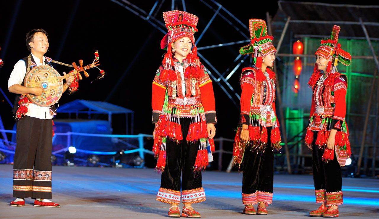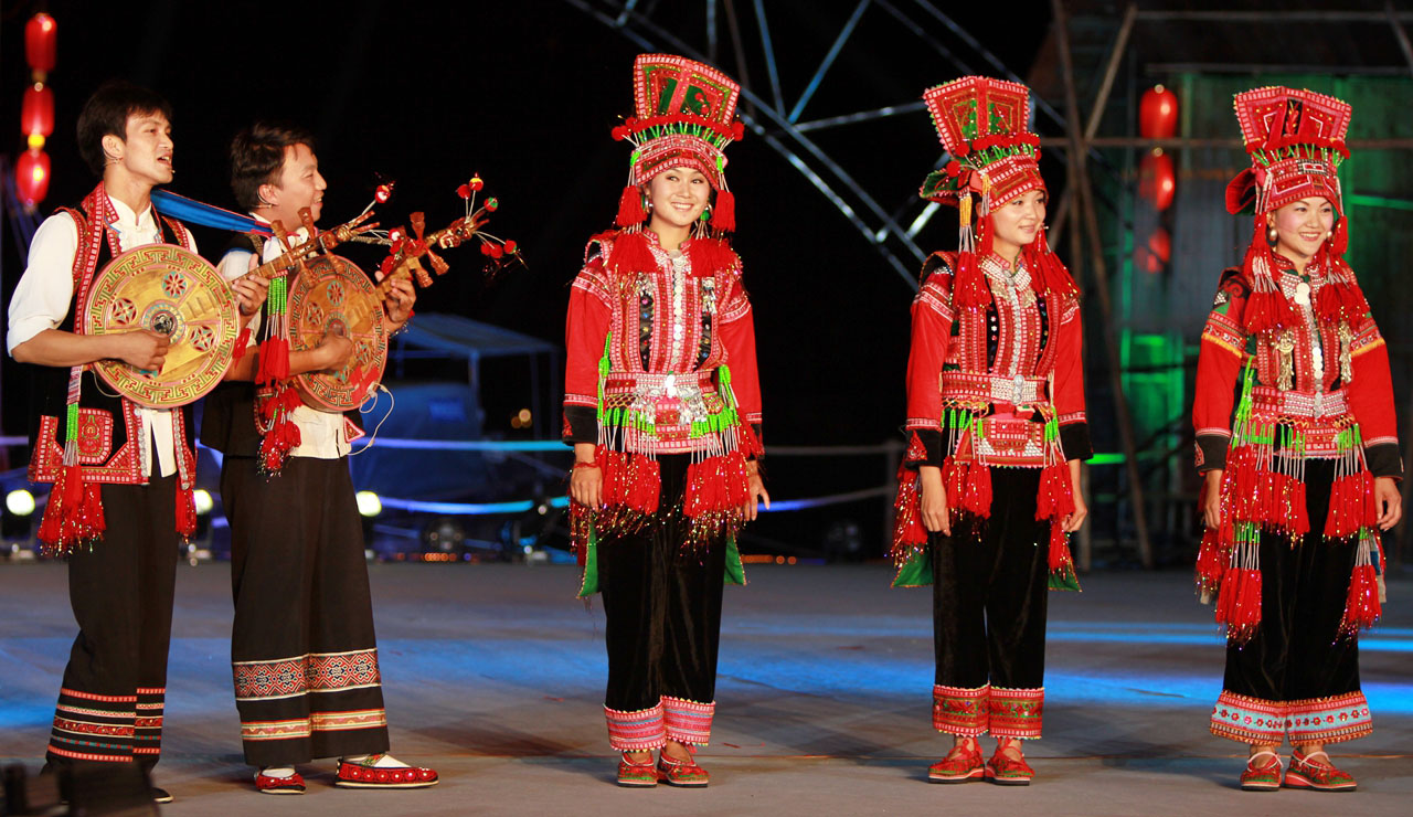 在四弦琴引头下,花腰歌舞曲调流畅欢快,歌词丰富,歌以合节,腹前击掌。花腰歌舞曲调分为72调,多为情歌和叙事长诗,保持了汉代以来的原始的踏歌遗风,音乐曲调优美动听,旋律节奏感强,有演唱、对唱等形式。