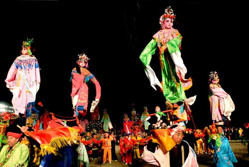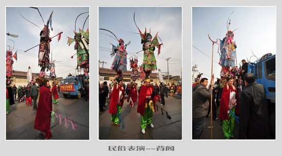背阁:山西阳泉民间百戏形式之一。以一人背扛另一人的“阁”类舞蹈。制法是:制一铁十字架形,下端制2个铁托子,架在背者两肩,用绳子固定。十字架上置一男童或女童。