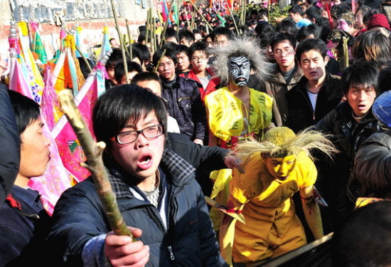 大鬼、二鬼、跳鬼在手持柳棍的村民簇拥下押着作祟黄鬼游街
