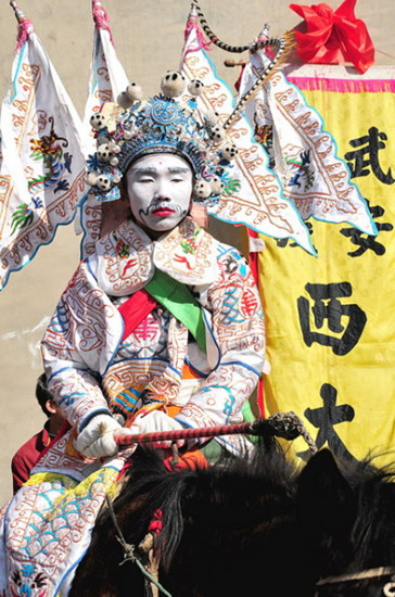 身穿铠甲、扎着靠旗的黑白探马引路