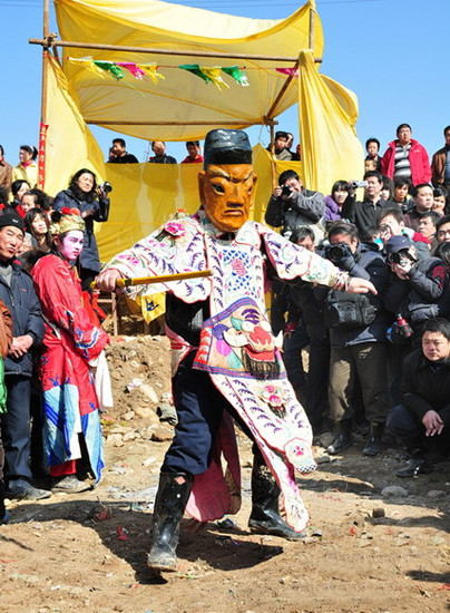 黄鬼被擒,吉祥如意。村里表演队伍开始庆祝,旱船、秧歌、舞狮子,各式花车齐上阵。最后,黄鬼押上斩鬼台时,群情激奋,礼炮震天。透过弥漫的烟雾,黄鬼被就地正法,鲜血喷溅,象征着人类对邪恶的胜利。这成为整个活动的高潮。黄鬼被斩后,傩戏就在村中的老戏台上演。