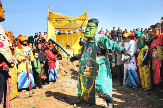 正月十五:凌晨三点左右开始踏鞭,大鬼二鬼开始转村转户,早晨七点左右抓住黄鬼,开始引道子,转村,中午到村外的斩妖台,审判,将黄鬼抽肠剥皮,傩戏的最高潮部分。