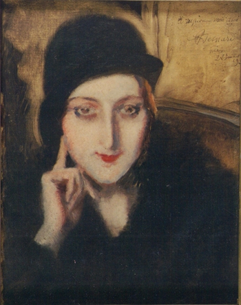 此作品应该是1933年在法国国立网球场现代美术馆举办中国艺术展期间,贝纳尔在家中招待徐悲鸿时赠予他的礼物。画幅上的题词是 “献给我的朋友徐悲鸿——阿尔伯特贝纳尔,1933年7月28日于巴黎 ”。在贝纳尔生命的最后几年里,他习惯用偏暗的色调作画。画面上的人物戴着一顶黑色帽子。观众的所有注意力会集中在黑色映衬下的苍白的脸庞和手上,嘴部尤为突出的红色笔触让整幅画鲜亮起来。