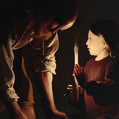 在西方油画史上,乔治·德·拉·图尔最著名的便是他描绘夜间场景的才华,黑夜中,唯有烛光或炉火的余烬得以穿透黑暗。观众通常只能看到画中的部分光源,其余部分则被遮蔽了,这样更加有助于强调独特的光影语言及其微妙的层次变化。深沉、含蓄、静谧的画面,几乎完全的棕色调,有效地描绘出光影的效果。乔治·德·拉·图尔对光完美的运用赢得了世人的景仰,使他成为世界上最受欢迎的法国艺术家之一,中国画家尹欣的油画便是很好的证明。