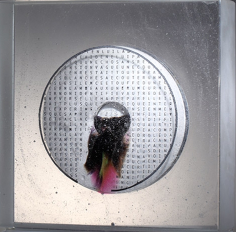 在空间中,定格瞬间。作品中央的黝黑色泽,像一股时间之泉,自喃喃的文字中,慢泄而下,无法拦截。流成相近却相异的色阶。