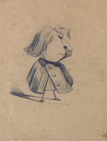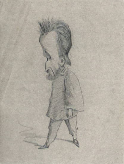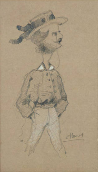 这幅讽刺肖像画呈现了记者泰奥多尔·佩洛凯。他是前卫艺术的评论家,曾在1858年出版《当代艺术家袖珍辞典》。年轻的莫奈初抵巴黎时,在烈士酒馆结识了佩洛凯,他们很快成为形影不离的好友。当莫奈与克莱孟梭初次会面时,佩洛凯也在场。克莱孟梭记得很清楚:“当我第一次遇见莫奈时,是在拉丁区。他身旁几乎总是陪伴着佩洛凯这位特约记者。佩洛凯机智敏锐,但却总是无精打采,常以一种美妙又刻薄的坦率嘲笑每一个人,而且先从嘲笑自己开始。佩洛凯空闲时会写写艺术评论,并且大力支持年轻艺术家,所以莫奈非常喜欢佩洛凯。”克莱孟梭接着描述了记者的外貌,结果与这幅讽刺肖像所描绘的相当接近:“我对佩洛凯留下的印象和记忆是两个充满热情的大眼睛,鼻子的弧度有点像阿拉伯人,还有黑色的杂乱胡须。”