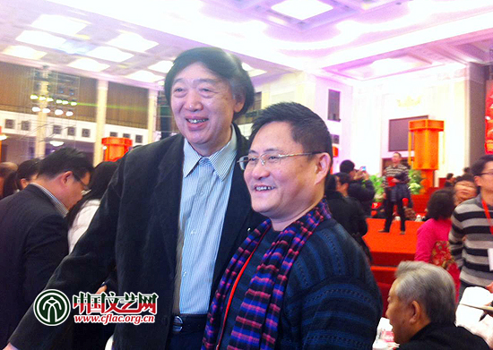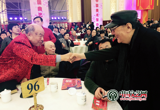 1月24日,“百花迎春——中国文学艺术界2015春节大联欢”在人民大会堂进行。图为老友遇老友,激动握手,互相问候。