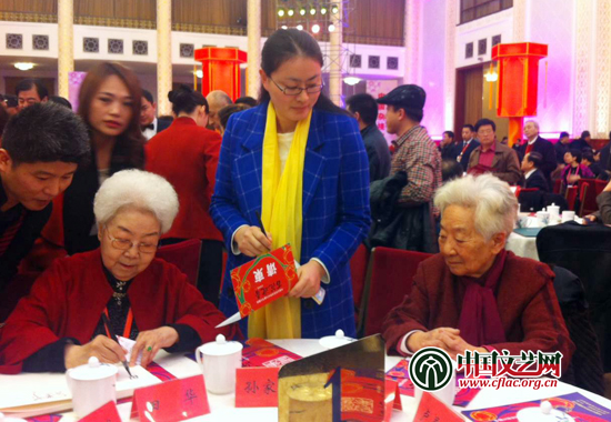 1月24日,“百花迎春——中国文学艺术界2015春节大联欢”在人民大会堂进行。图为演出开始前,观众找老艺术家签名。