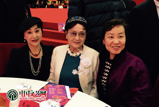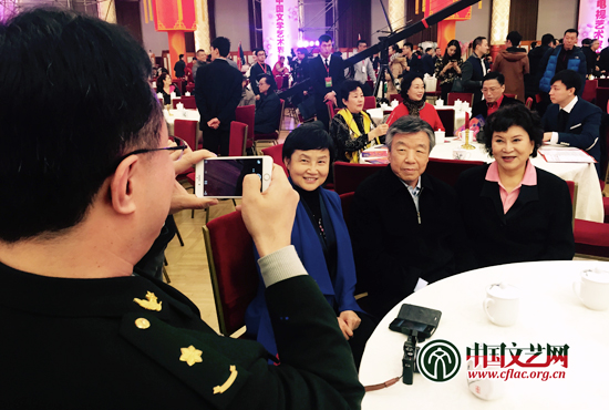 1月24日,“百花迎春——中国文学艺术界2015春节大联欢”在人民大会堂进行。图为演出开始前,老朋友们抓紧时间合影。