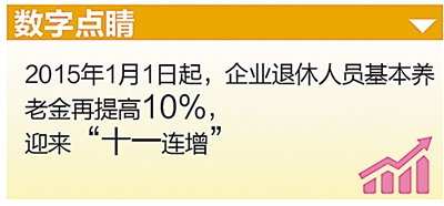 再度提高企业员工基本养老金,从2015年1月1日起,企业退休人员基本养老金再提高10%,预计将近8000万名退休人员受益。事业单位和企业员工的养老金水平逐步拉近。
