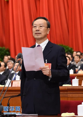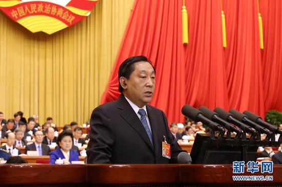 受政协第十二届全国委员会常务委员会委托,齐续春向大会报告政协十二届二次会议以来的提案工作情况。新华社记者 姚大伟 摄