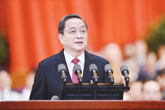 俞正声代表政协第十二届全国委员会常务委员会,向大会报告工作。