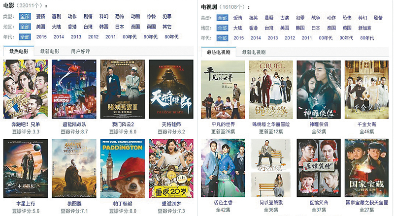 互联网行业对影视产品的高效整合为网民观看提供了极大方便,以影视剧为代表的网络视频内容正是各大互联网企业争夺的焦点之一。图为百度搜索“电影”“电视剧”结果的截图