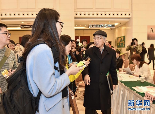 3月2日,全国政协委员靳尚谊(前右)在驻地北京会议中心报到。 当日,出席全国政协十二届三次会议的委员陆续报到。 新华社记者李贺摄