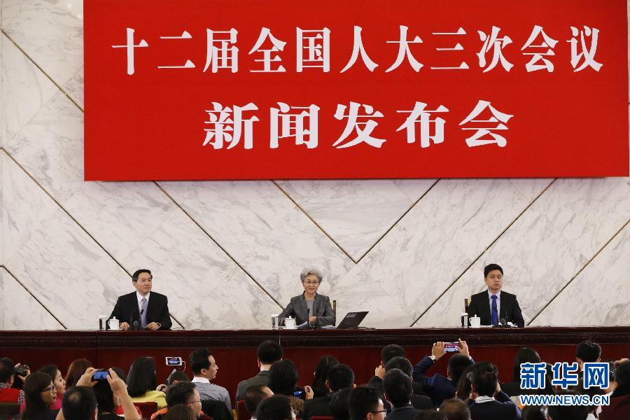 3月4日,十二届全国人大三次会议在北京人民大会堂举行新闻发布会。大会发言人傅莹介绍本次会议的有关情况,并回答中外记者提问。新华社记者李响摄