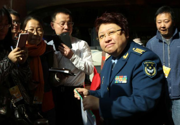 2015年3月2日,全国政协委员韩红抵达驻地北京国际饭店报到,驻地工作人员、媒体记者前来围观并纷纷拍摄。(郭俊锋摄/光明图片)