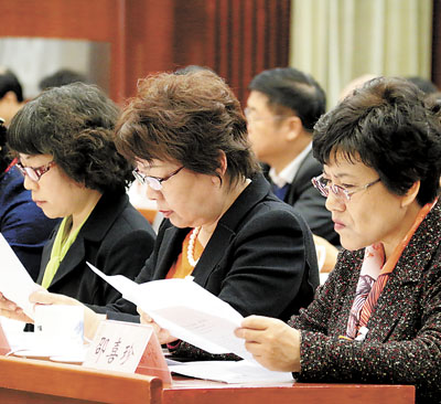 3日,河北代表团驻地会议室,几名女代表在仔细阅读文件。记者 史自强摄