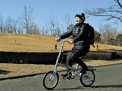 3日,全国人大代表、中国音乐学院教授吴碧霞骑着自行车到北京会议中心代表驻地报到,这已是她第四年骑单车上两会。“骑单车上两会就是为了唤起人们低碳环保的意识。”吴碧霞说。记者 王昊男摄