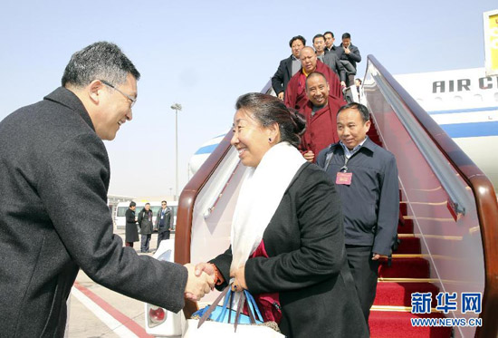 3月2日,出席十二届全国人大三次会议的西藏自治区代表团抵达北京。新华社记者丁林摄