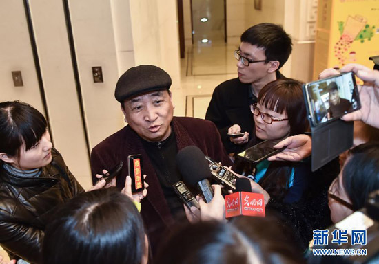 3月2日,全国政协委员姜昆在驻地北京会议中心报到时接受媒体记者采访。 当日,出席全国政协十二届三次会议的委员陆续报到。新华社记者李贺摄