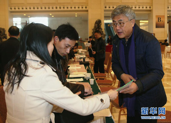 3月1日,全国政协委员赵长青(右)抵达北京会议中心报到。 当日,出席全国政协十二届三次会议的委员陆续报到。 新华社记者 王申 摄