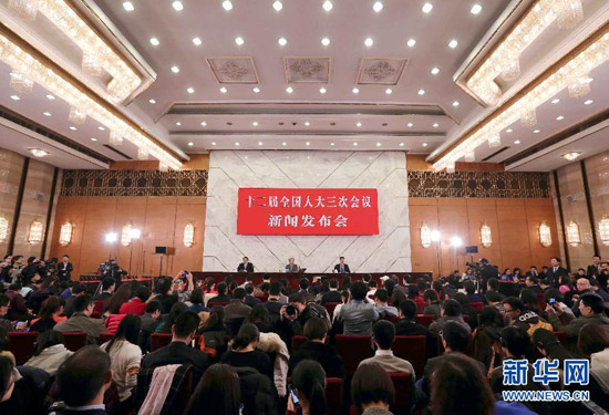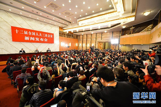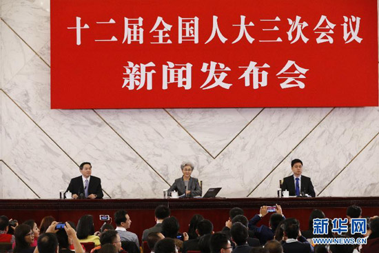3月4日,十二届全国人大三次会议在北京人民大会堂举行新闻发布会。大会发言人傅莹介绍本次会议的有关情况,并回答中外记者提问。新华社记者李响摄