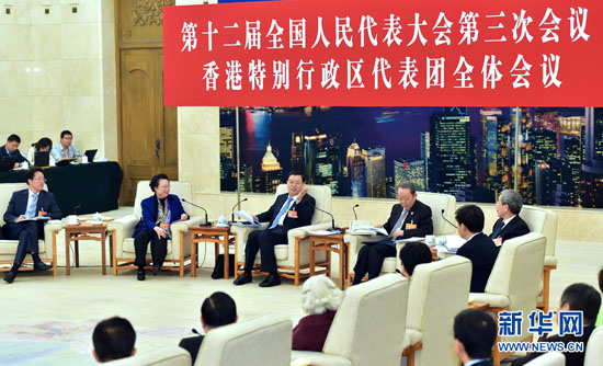 3月6日,中共中央政治局常委、全国人大常委会委员长张德江参加十二届全国人大三次会议香港代表团的审议。 新华社记者 李涛 摄